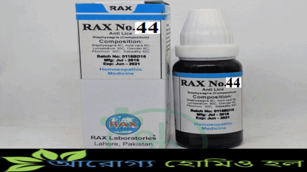 র্যাক্স নং- ৪৪ (গণোরিয়া) RAX NO – 44 (Kali Sulf Comp) ক্যাটাগরি : পাকিস্তানী হোমিওপ্যাথিক কম্বিনেশন ঔষধ। RAX NO – 44 মিশ্রণ : Kali Sulf 30C. Cantharis 30C. Merc Sol