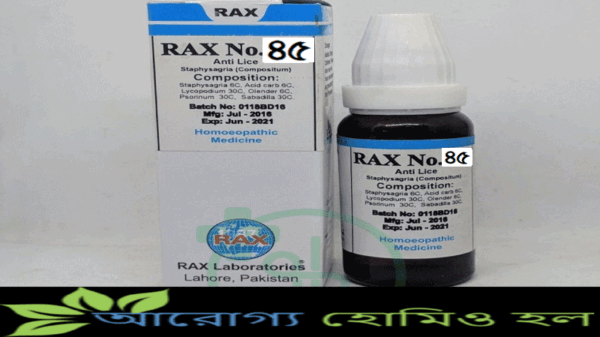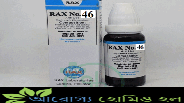 র্যাক্স নং- ৪৬ (প্যারালাইসিস) RAX NO – 46 (Causticum Comp) মিশ্রণ : Causticum 30C. Baryta Carb 30C. Cocculus 30C. Gelsemium 30C. Oleander 30C. Rhus Tox 30C. প্রস্তুত প্রণালী : পাকিস্থনী