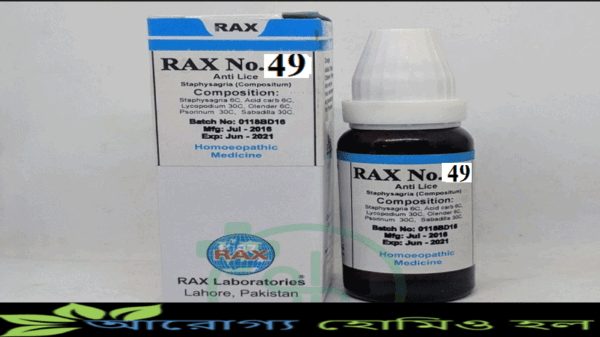 র্যাক্স নং- ৪৯ (সুচিবায়ু/মানসিক বিকার) RAX NO – 49 (Hyoscymus Comp) প্রস্তুত প্রণালী : পাকিস্থানী হোমিওপ্যাথিক কম্বিনেশন পটেন্সি ড্রপ। র্যাক্স নং- ৪৯ মিশ্রণ : Hyoscymus 30C. Agaricus Mus 30C, Anacardium